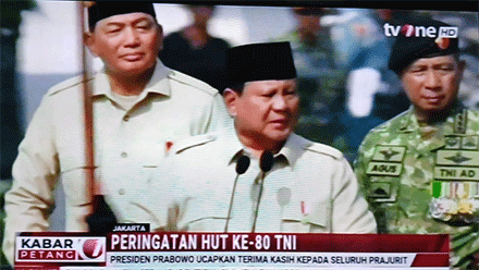 Prabowo berjalan tegap di depan barisan dan berkata lantang, “Terima kasih pengabdianmu, terima kasih pengabdianmu,” kepada setiap prajurit. Kalimat itu menggema di lapangan dan membuat para peserta serta tamu undangan bertepuk tangan penuh semangat.
