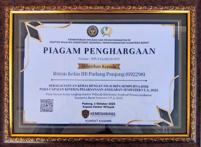 Padang Panjang, albrita.com–Rumah Tahanan Negara (Rutan) Kelas IIB Padang Panjang mencatat prestasi gemilang setelah meraih nilai sempurna 100 dalam kinerja pelaksanaan anggaran semester pertama tahun 2025. Kantor Wilayah Kementerian Imigrasi dan Pemasyarakatan Sumatera Barat menyerahkan penghargaan itu saat Rapat Koordinasi Kanwil Imipas Sumbar di LPKA Payakumbuh, Tanjung Pati, Sabtu (4/10).
